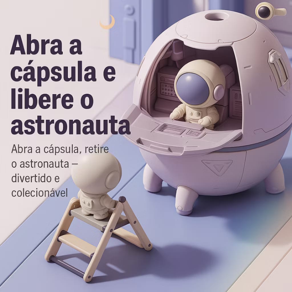 Seu design criativo, com cápsula espacial e boneco astronauta, é perfeito para quem ama decoração moderna e tecnologia.